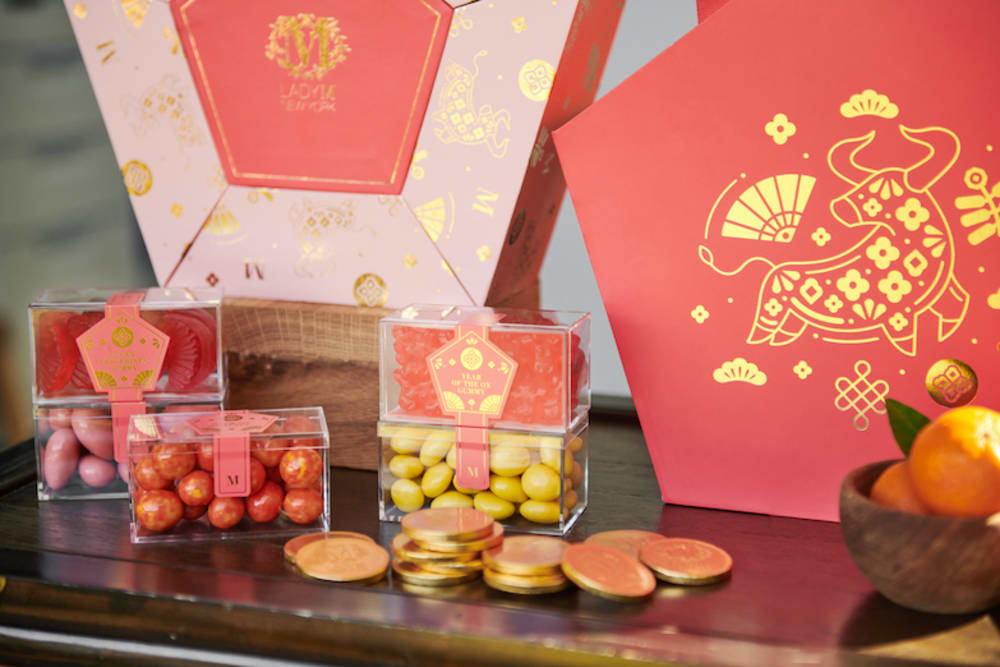 We always look forward to Lady M’s beautifully packaged CNY offerings, and this year is no exception. The red-and-gold pentagon-shaped 2021 Lunar New Year gift set ($628) is a treasure trove containing a collection of innovative confections – we especially heart the lucky tangerine gummies, prosperity pink almonds and Lunar New Year chocolate coins, which are all packaged in reusable keepsake boxes – as well as eight Lady M red envelopes for gifting. Available until 17 February at all Lady M boutiques (only from 9–17 February at the Times Square and Harbour City shops).