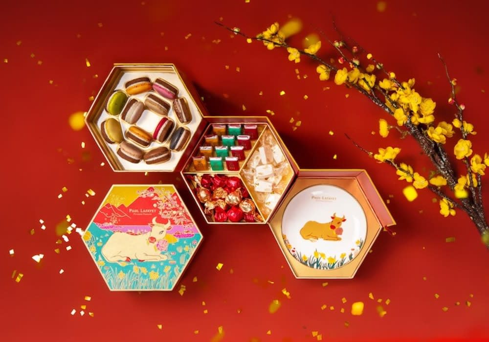 Popular patissier Paul Lafayet’s Golden Ox gift box 2021 ($688) is a three-tiered festive treat. The first tier showcases the bakery’s brand-new dessert creation, the cookiron, which is macaron-cookie hybrid filled with Madagascan vanilla cream ganache – a textural delight. In the second tier, an assortment of French confections await, from pistachio and almond nougat to hazelnut milk pralines. You can serve these goodies on the specially designed collectable bone-china plate in the bottom tier. In-store collection from 25 January.