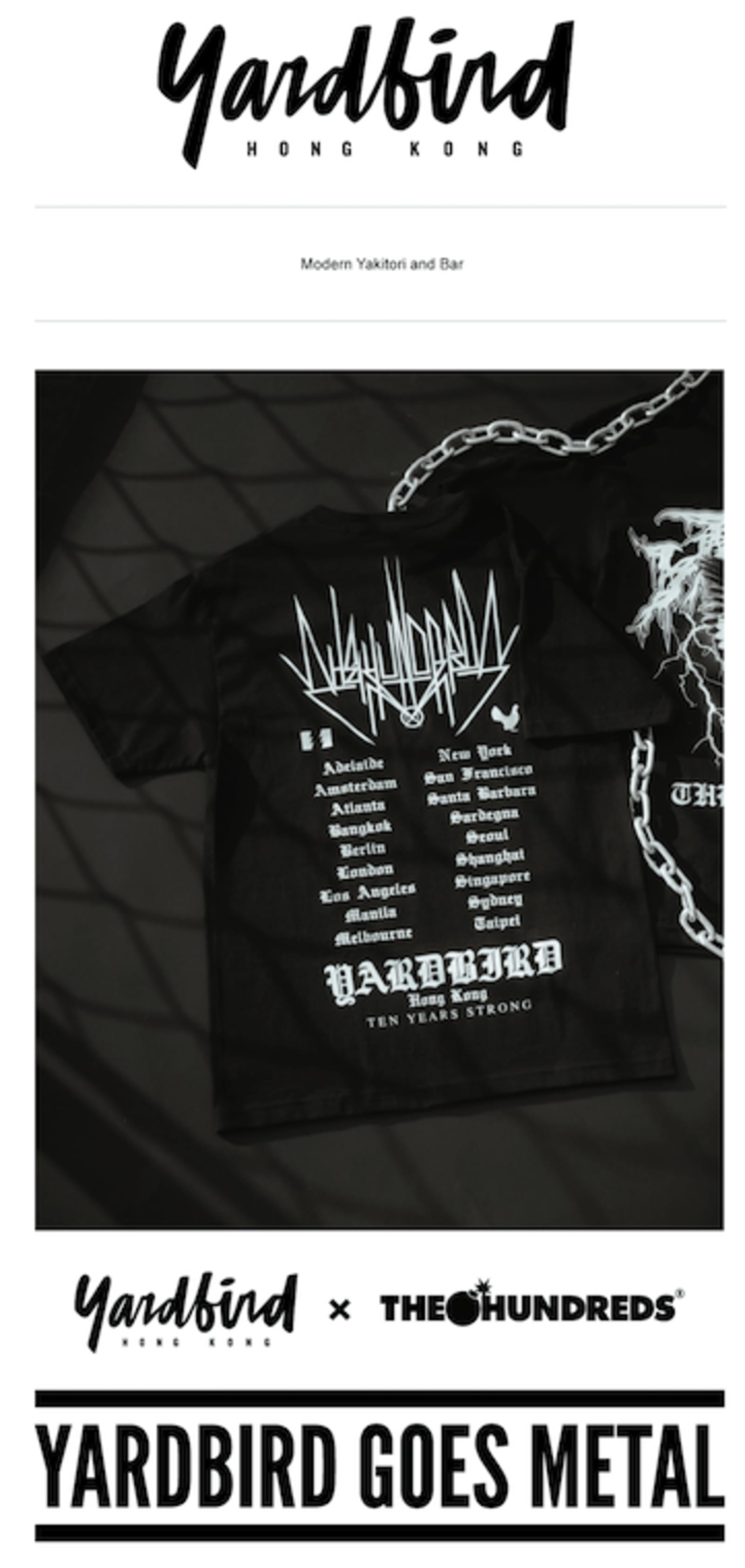 Has it really been 10 years since Yardbird clucked its way into the 852? To celebrate this achievement, the team will be popping up at The Pontiac (coincidentally, also celebrating their recent win at Asia’s 50 Best Bars 2021) on Saturday, 15 May from 6–10pm. The Pontiac team have curated some special cocktails along with a gnarly metal playlist. Yardbird will also be debuting their 10th-anniverary band-style T-shirt by streetwear brand The Hundreds here, commemorating all the locales around the world where they’ve popped up over the past decade.