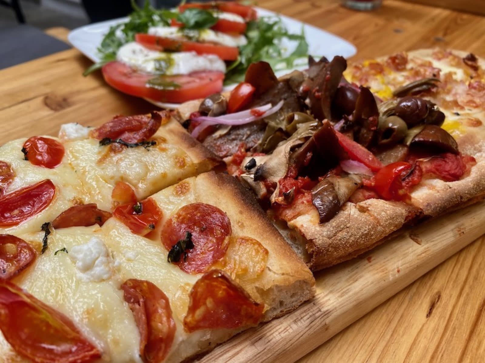 A self-dubbed street-food pizzeria, PALA’s claim to fame is that its artisanal pizza dough is fermented for a whopping 72 hours. Run by a chef who was raised in Rome, PALA serves both classic 12-inch round pizzas and smaller pizza alla pala, translated as “paddle pizza”, pizza squares originating in Rome that are served on long-handled wooden boards. These pizzas are made with a highly hydrated dough (about 80% water) and baked quickly in an electric oven at a high temperature.