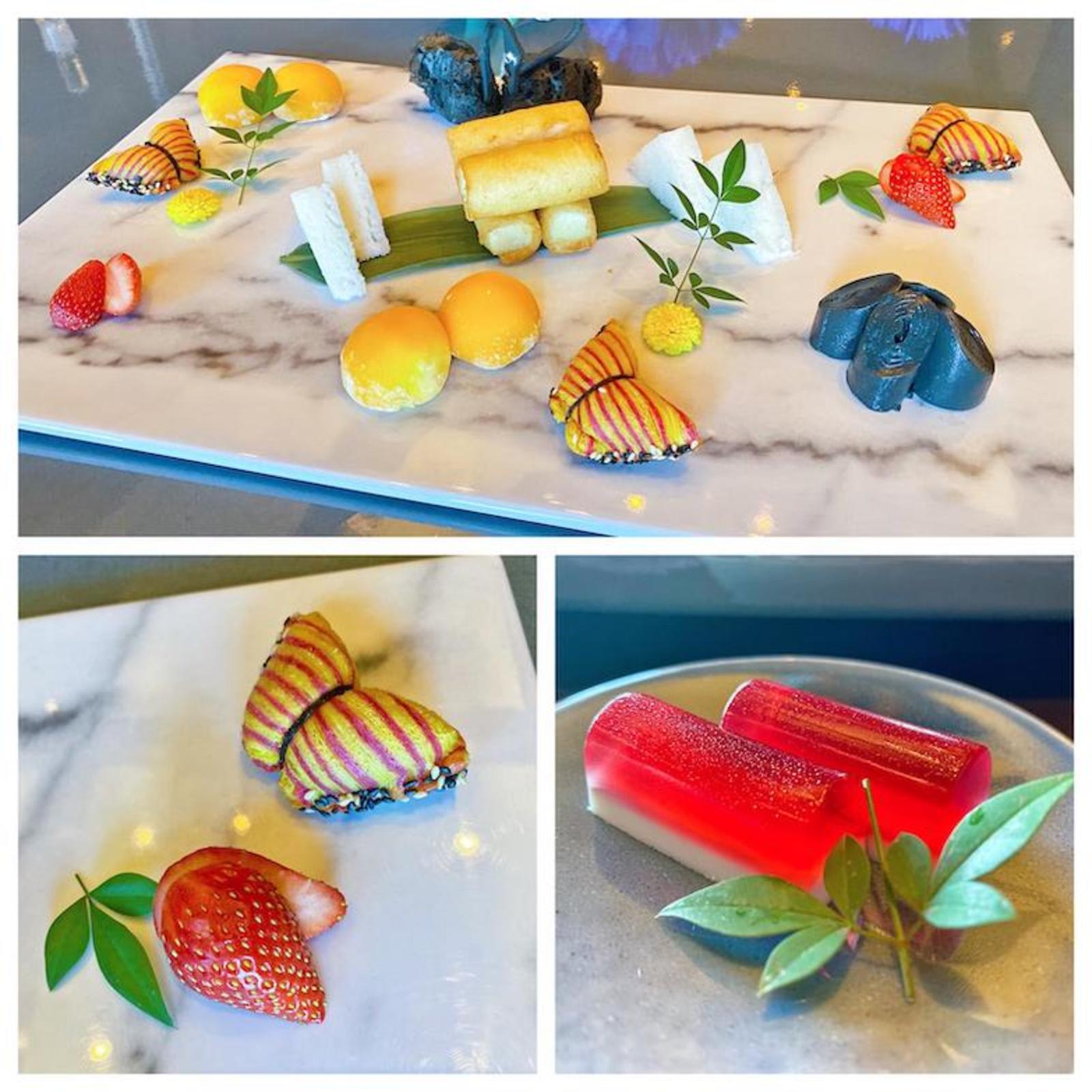 We concluded our feast with a pageantry of beautiful sweet treats, including strawberry palmiers in the shape of striped butterflies, black sesame rolls, white sugar pudding, cream-filled mango mochi, baked black taro puffs filled with sweet custard crafted in the shape of swans and deep-fried milk rolls.