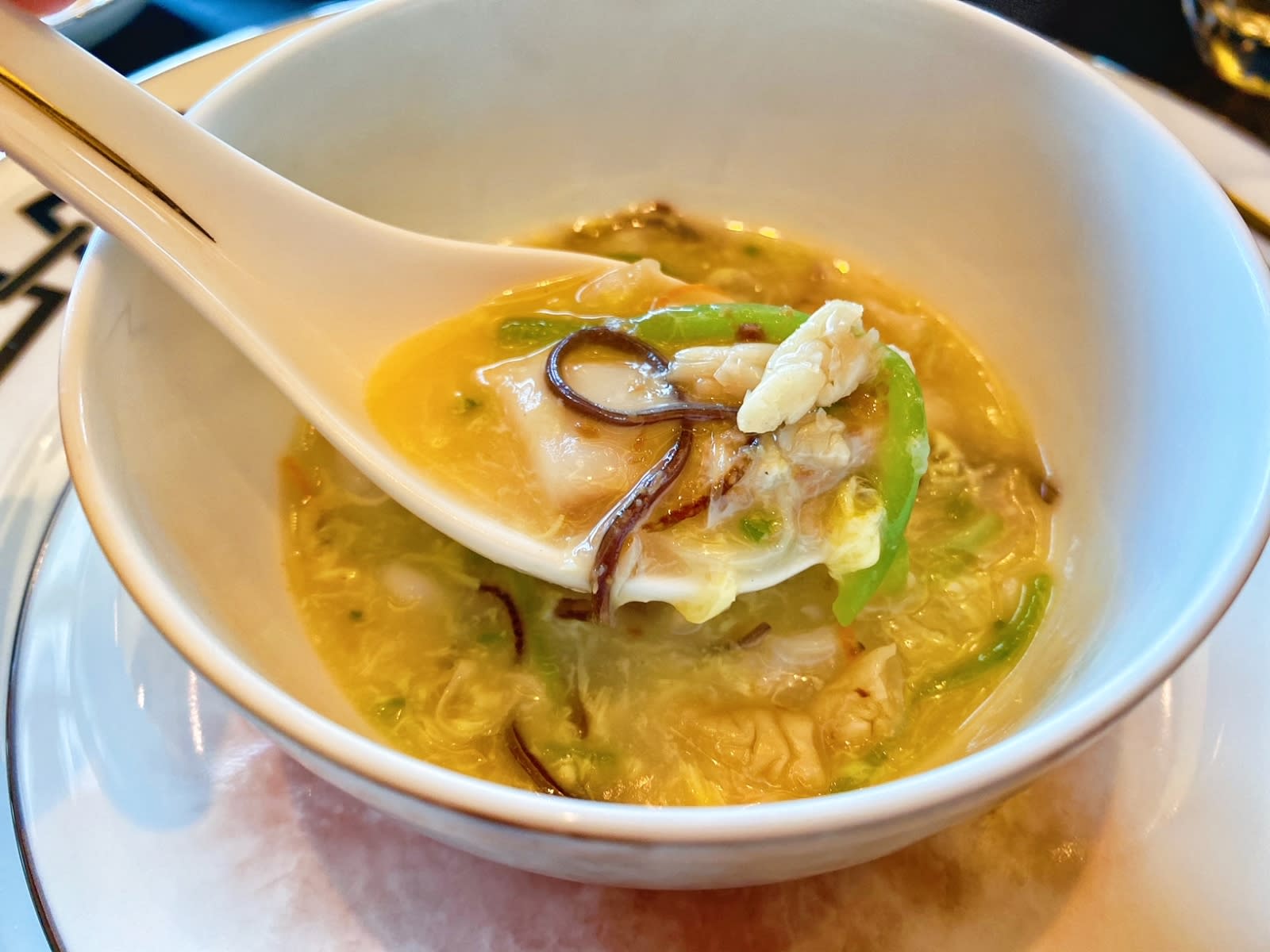 A treasure trove of delicate dim sum followed, comprised of vegetable dumpling wrapped in bamboo pith with black truffle ($90), pork dumpling topped with bouncy, plump abalone ($120) and an adorable fish dumpling ($90), shaped painstakingly and painted to resemble an actual fish. The fish dumpling uses hand-picked fish meat to ensure no stray bones, and it’s mixed with crunchy wood fungus and tangerine peel for textural and flavour contrast.