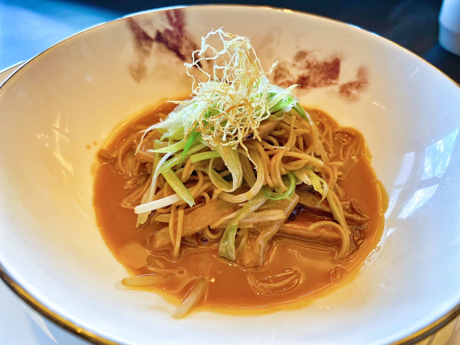 Bathed in a rich, creamy sauce, the braised porcini noodles ($300) come interlaced with plump ribbons of fish maw, fresh porcini and spring onion. The crispy ginger strands that crown the noodles provide subtle hints of heat. We drenched each strand of noodles in the collagen-packed sauce (thanks to the fish maw) to maximise the flavour impact of each bite. Porcini mushrooms are also incorporated into the actual noodles, although we couldn’t quite detect the taste of the fungi as the sauce is already filled with so much flavour.