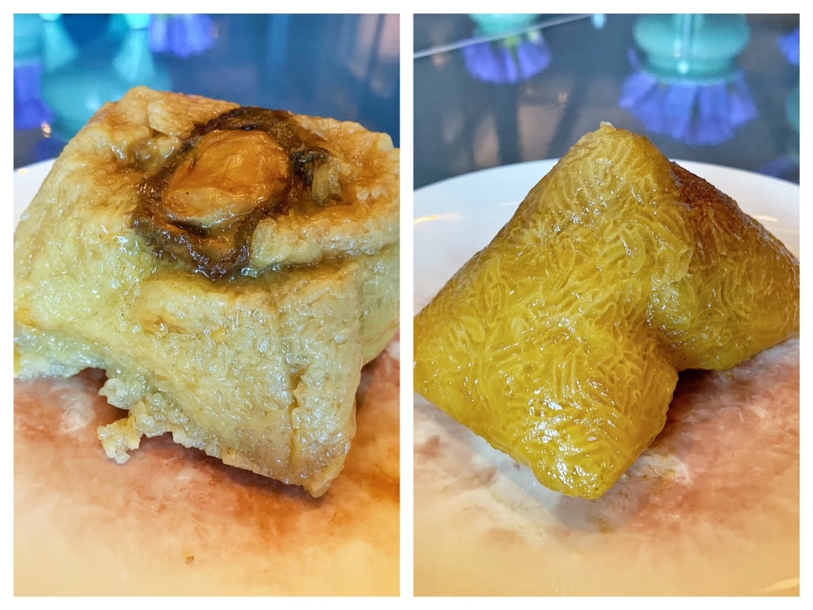 The sweet sticky rice dumpling (right) has a filling of whole chestnuts and gooey lotus-seed paste. We’re big fans of sweet sticky rice, although the alkaline taste of this dumpling is certainly an acquired taste (an alkaline solution is used to create an almost gel-like consistency in the rice). You can purchase a gift set ($588) containing two rice dumplings.