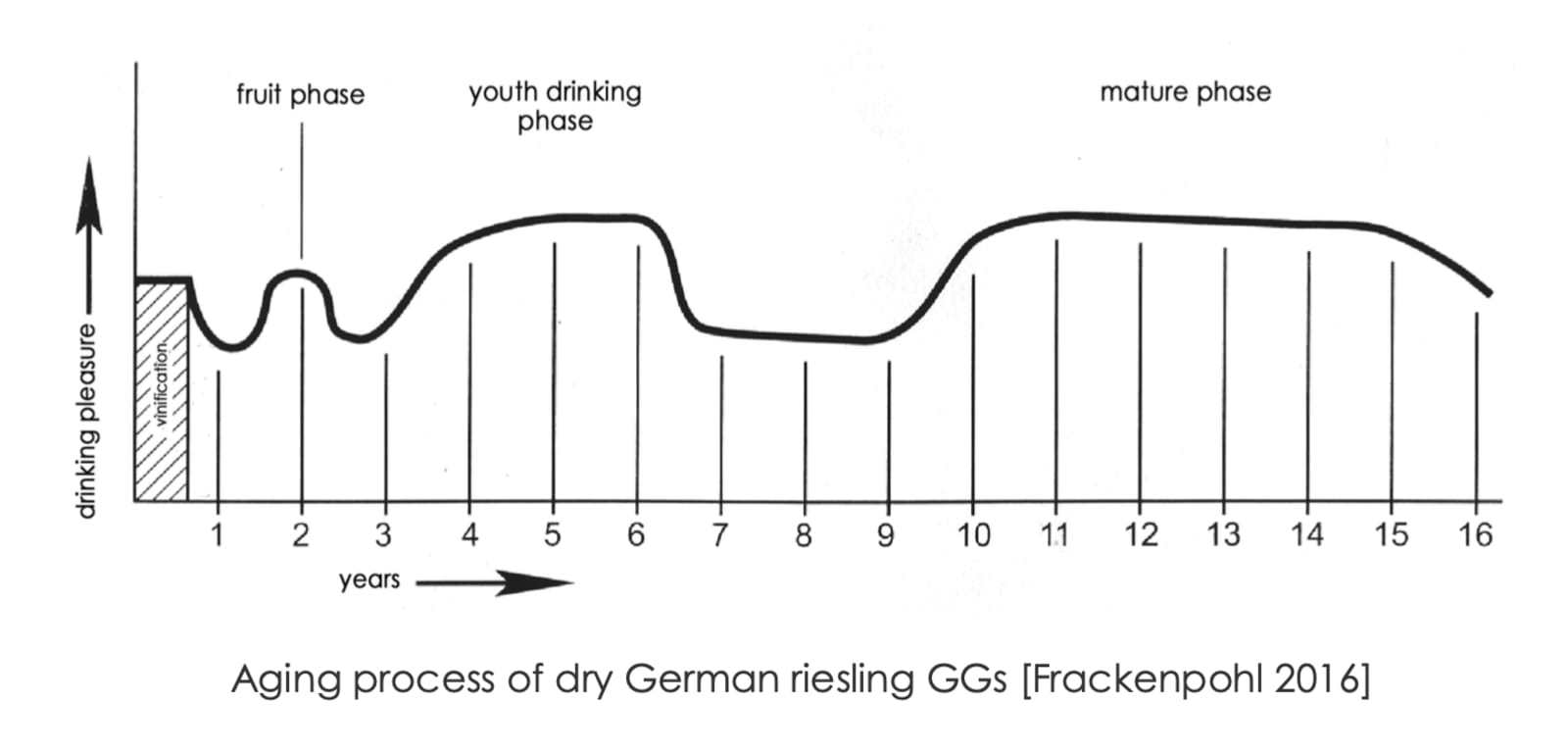 Lauer explained the ageing development of German GG Riesling. The wine is in its fruit phase when it is two years old, and then it closes down a bit before entering its youthful drinking phase between 4–6 years old. It shuts down again and wakes up to its mature phase at the age of 10, where the wine stays at this peak for at least five years. This timetable does not apply to all wine, but the development phase is similar. The quicker the shutdown phase begins, the shorter the ageing period.