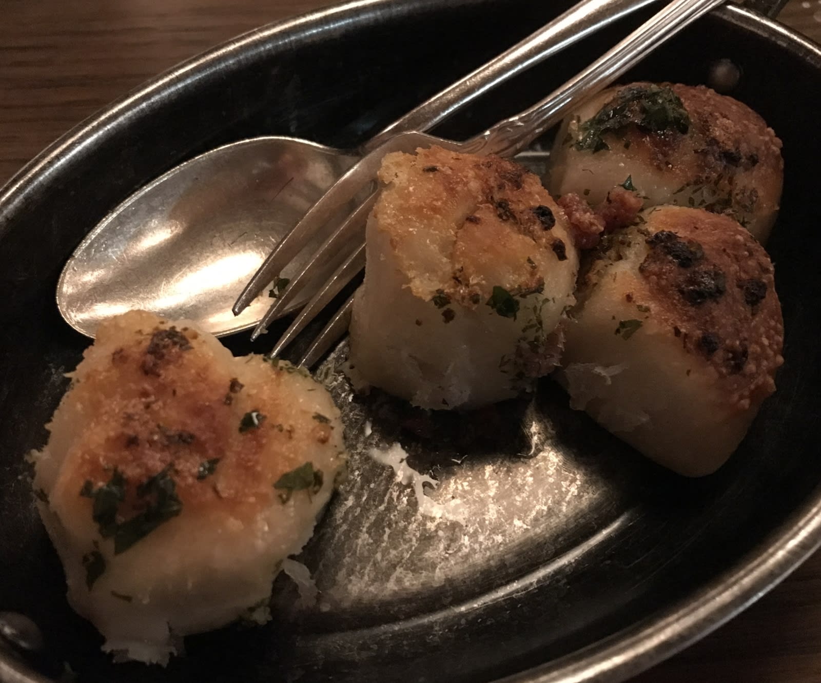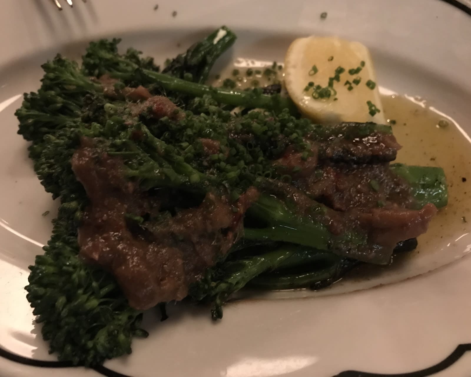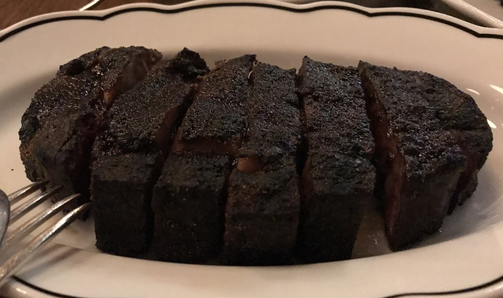 Along with your steaks, you get broccolini in a bagna càuda sauce. You love bagna càuda (a fondue of garlic, anchovy and olive oil, sometimes butter and cream) and wear a medical bracelet telling emergency responders to only put bagna càuda in your IV feed. This is a good bagna càuda, but again a bit mild. Broccolini is good, but broccoli rabe (which is distinctly more bitter) would have been better to your taste. You sense a caution in the kitchen to sometimes dial down when you wish they would dial up.