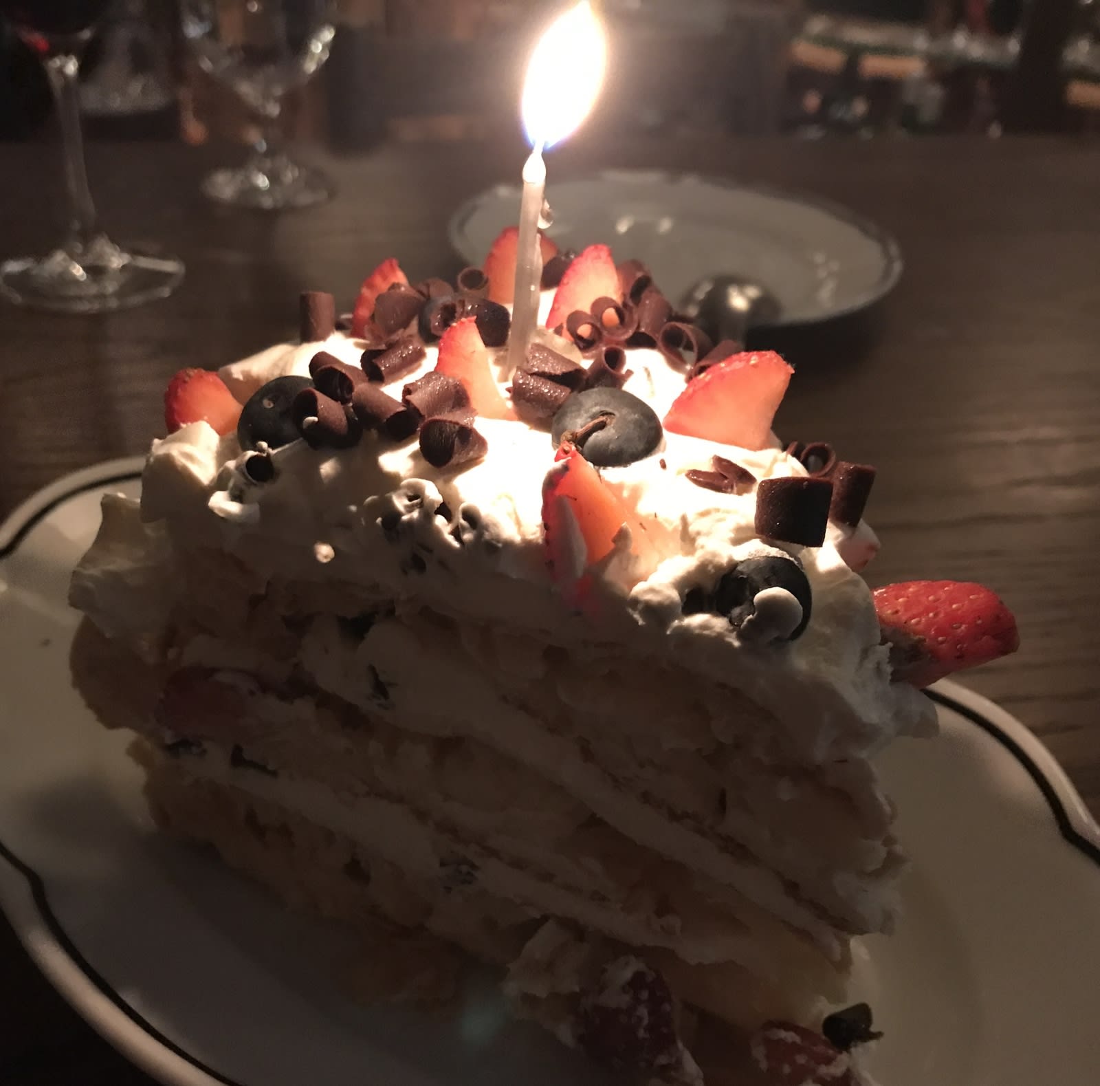 For dessert, the two of you split a dacquoise – a cake made with layers of meringue and whipped cream and, in this case, studded with berries and chocolate – and it’s phenomenal, memorable. It’s your birthday, and four servers come up and sing a birthday song (to be frank, you forget what it was…. you’d been drinking), but it is spirited and fun and you appreciate it.