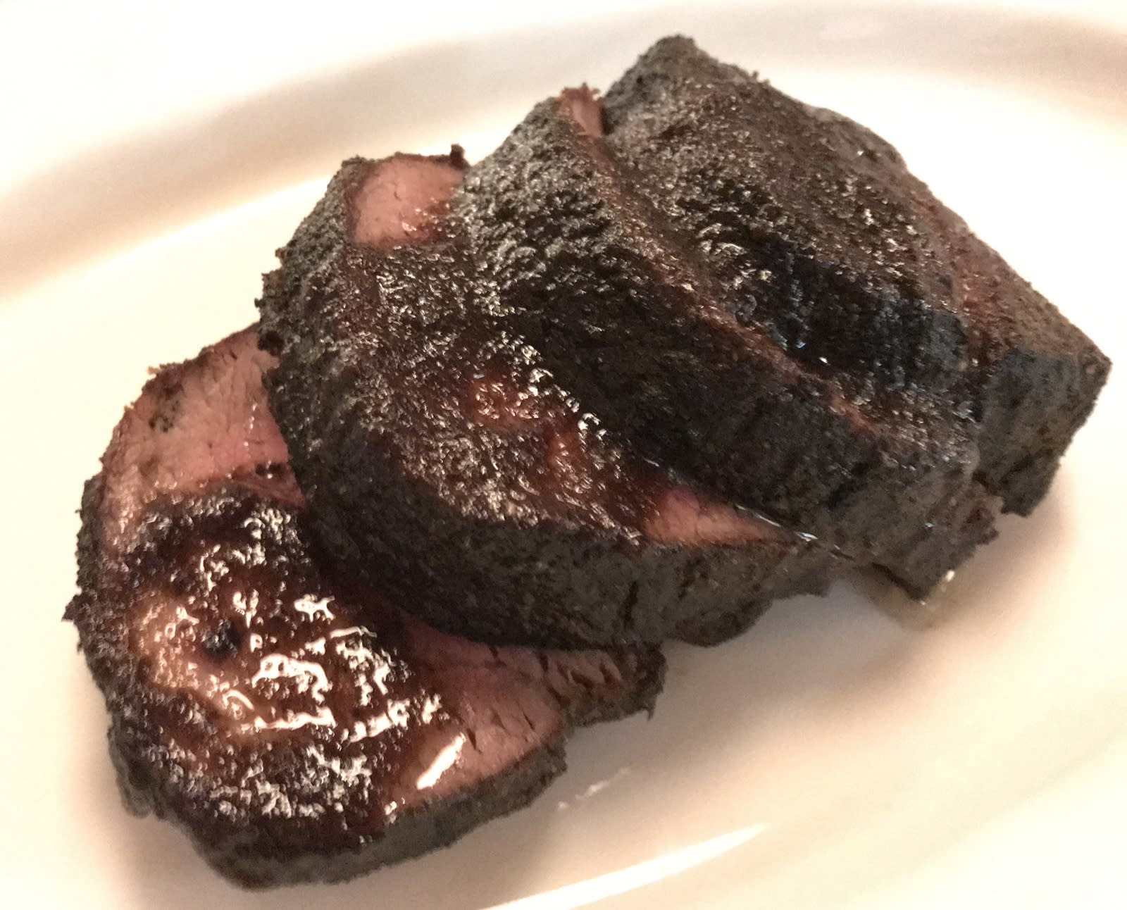 Both your steaks are Maillard reaction exemplars, charred deliciously over their entire surfaces. Your steak is accurately cooked, your wife’s not quite, coming out medium and consequently too dry. But, then again, filet mignon, which is less fatty than many other cuts, tends to dryness.
