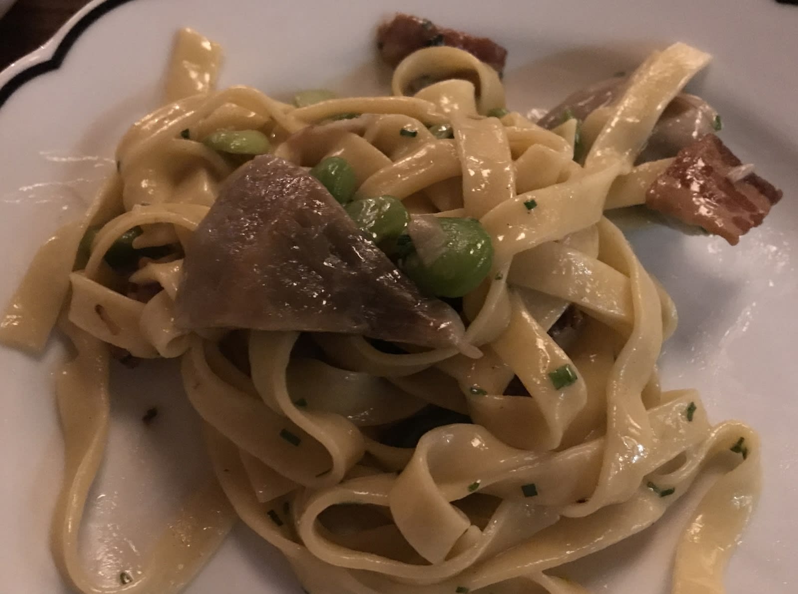Tagliatelle with artichoke. Fresh pasta is the devil to make well. It tends strongly to mushiness. Theirs, made solely with 00 flour and egg yolks, is outstanding, with a satisfying bite. Had they come by with a chunk of Parmesan and a grater to dust the pasta, as they used to do at serious NYC Italian restos (when waiters weren’t aspiring actors but dignified lifetime professionals), it would have been better yet.