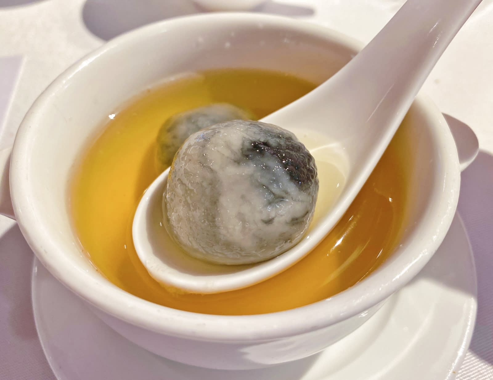 The black sesame glutinous balls in ginger soup is the only dish devoid of hairy crab. The chewy black sesame dumplings have a centre of lotus paste, with a slight savoury edge to counterbalance the sweet, spicy ginger soup.