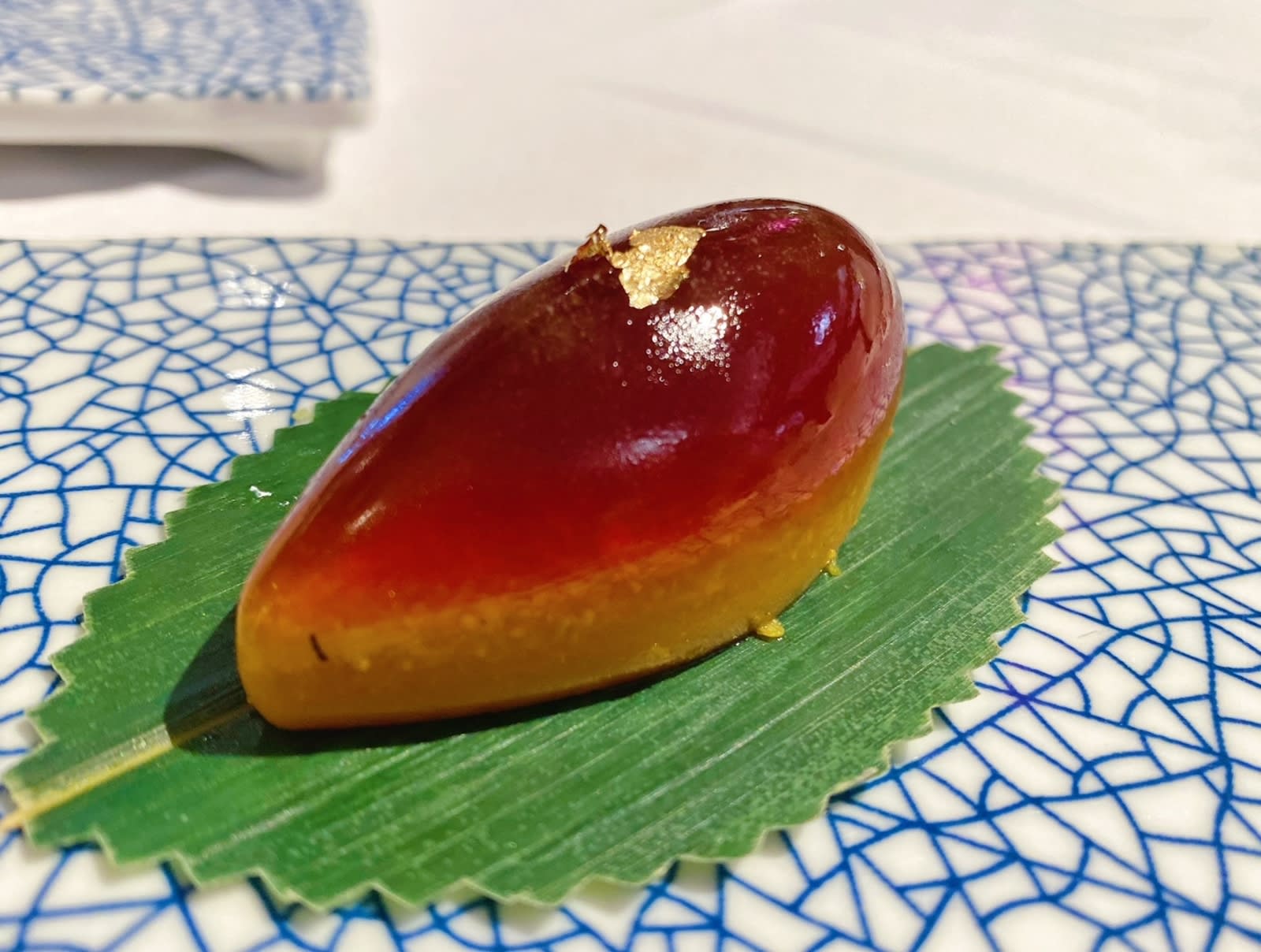 The pan-fried Japanese scallop with hairy crab roe is as delicious as it is beautiful. The scallop was cooked perfectly with a toothsome bounce, with petits pois adding pops of sweetness. The chewy spheres of gorgon fruit (鸡头米), which we would best compare to giant pearl couscous, allowed us to perpetuate the enjoyment of the roe sauce. Tiny shiso leaves add punches of freshness.