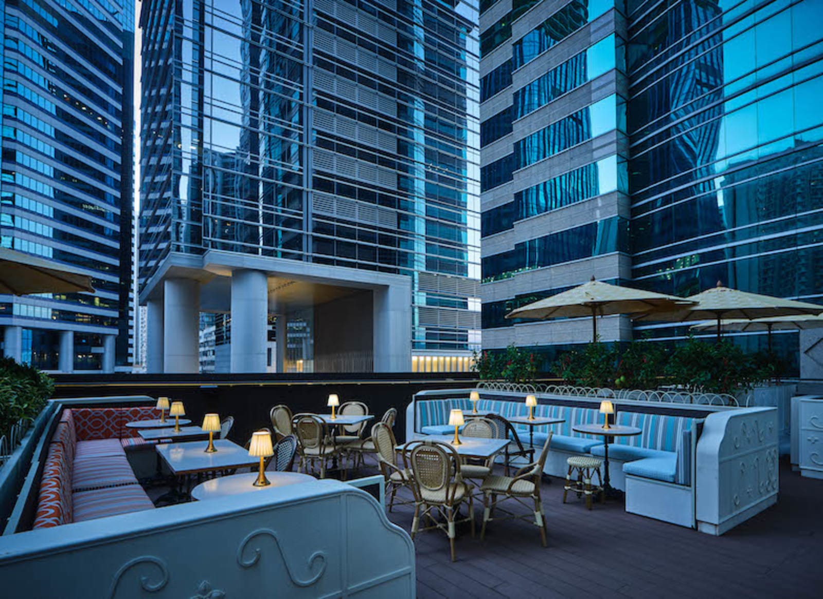 We began our evening (when it was still balmy!) at Tempo Tempo’s lovely outdoor space, flanked by skyscrapers and city lights. It’s decked out with big umbrellas, wicker chairs, candy-striped sofa seating, lemon trees and magical lighting – a temporary escape from HK life.