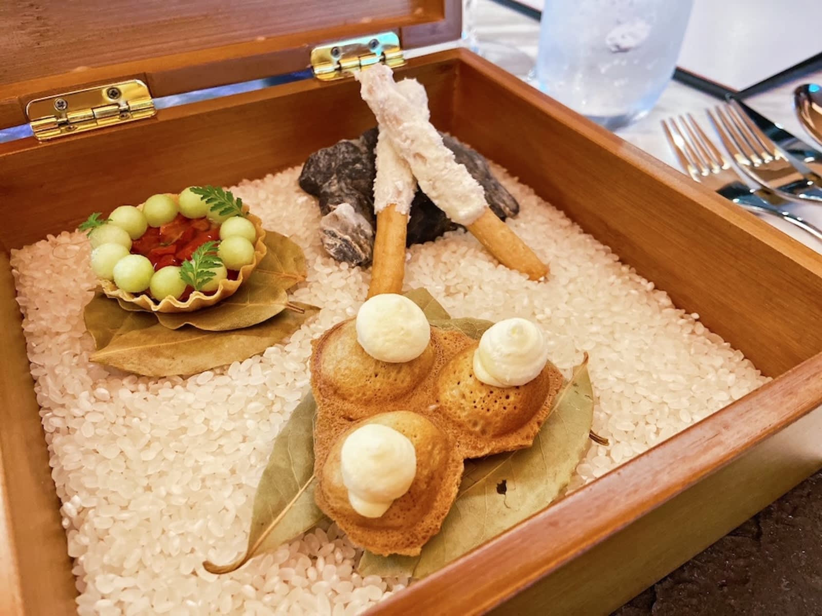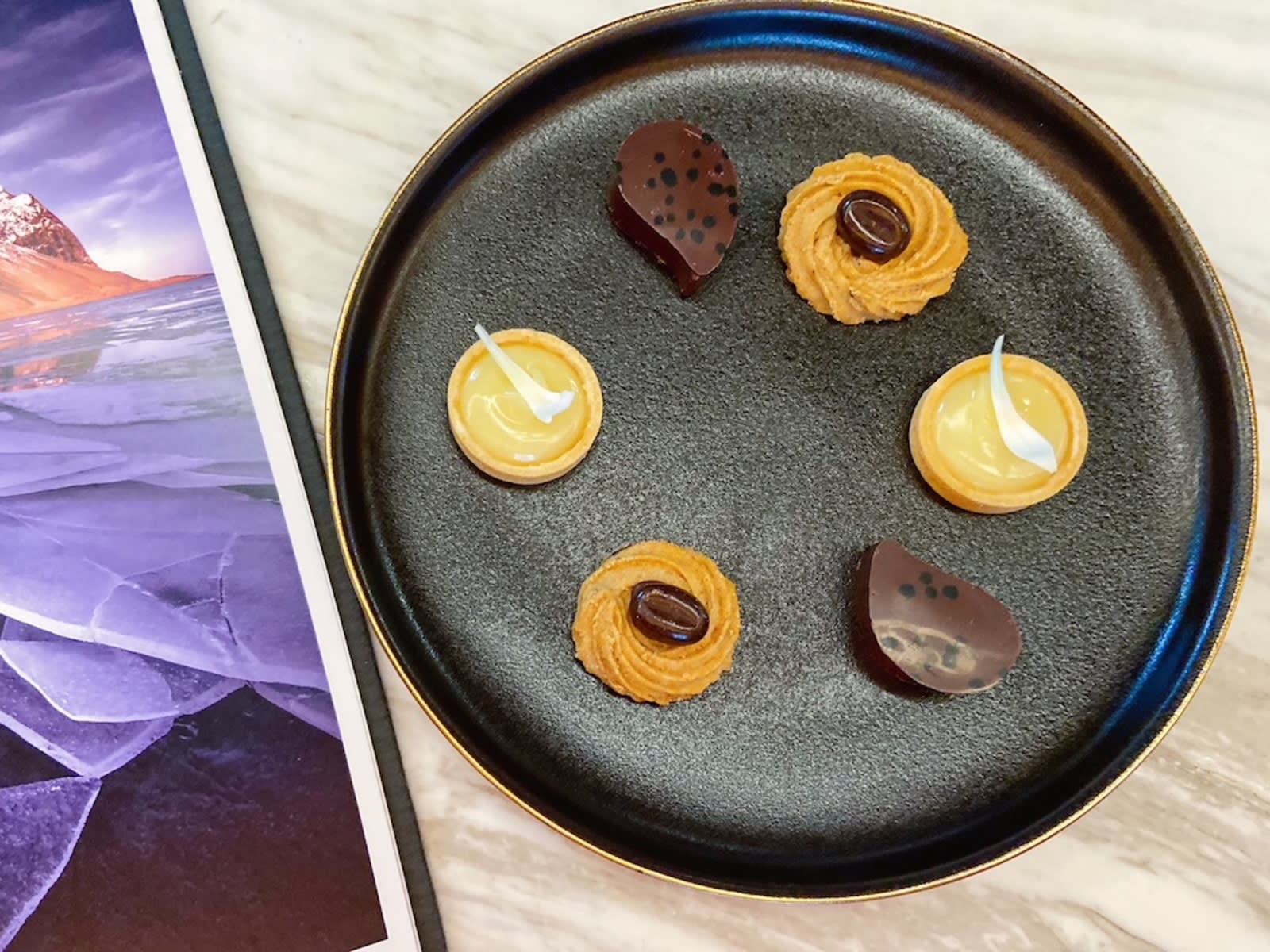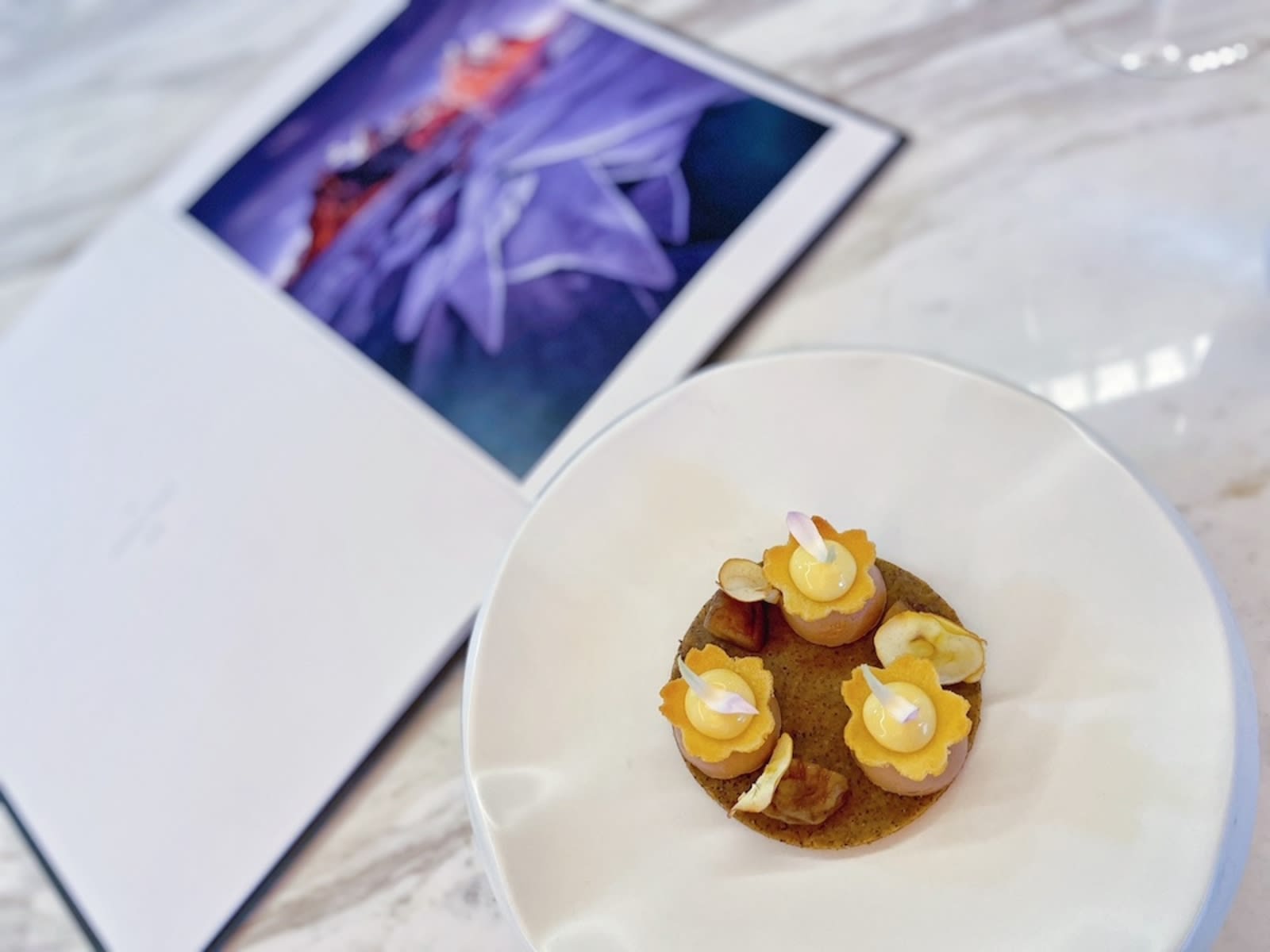 The delectables ranged from a delicate tomato tart bordered by tiny melon balls and drizzled with pomelo water, to an egg waffle topped with a cold, savoury cream, to breadsticks dipped in white truffle cream. We loved the robust, sun-ripened flavour of the diced tomatoes in the tart, as well as the temperature contrast between the hot egg waffle and icy, savoury cream.