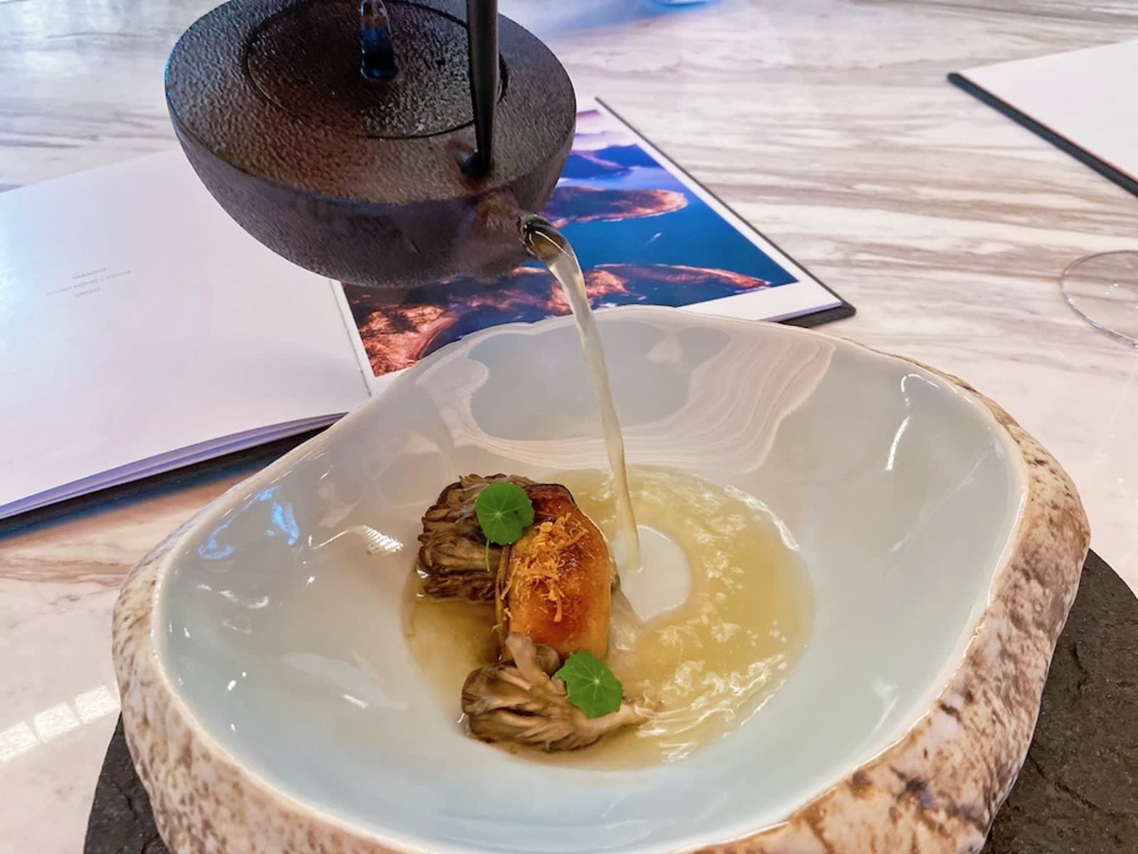 A perfect bowl to warm up with in the winter, the pork bone, dried scallop, local chicken and maitake mushroom consommé takes more than 10 hours of slow simmering to create and is poured from a teapot over a semi-dried oyster nestled between mushrooms. This dish is inspired by a photo of Sai Kung in Hong Kong, bordering a pearl farm. Chef Leung visited the pearl farm and noticed that once the pearls are harvested, the oyster meat is thrown away. He struck a deal with the farmer to harvest the oyster meat in his own kitchen in order to reduce food wastage. Hence, the dish is also named 东方之珠, which has the dual meaning of “pearl of the Orient”.