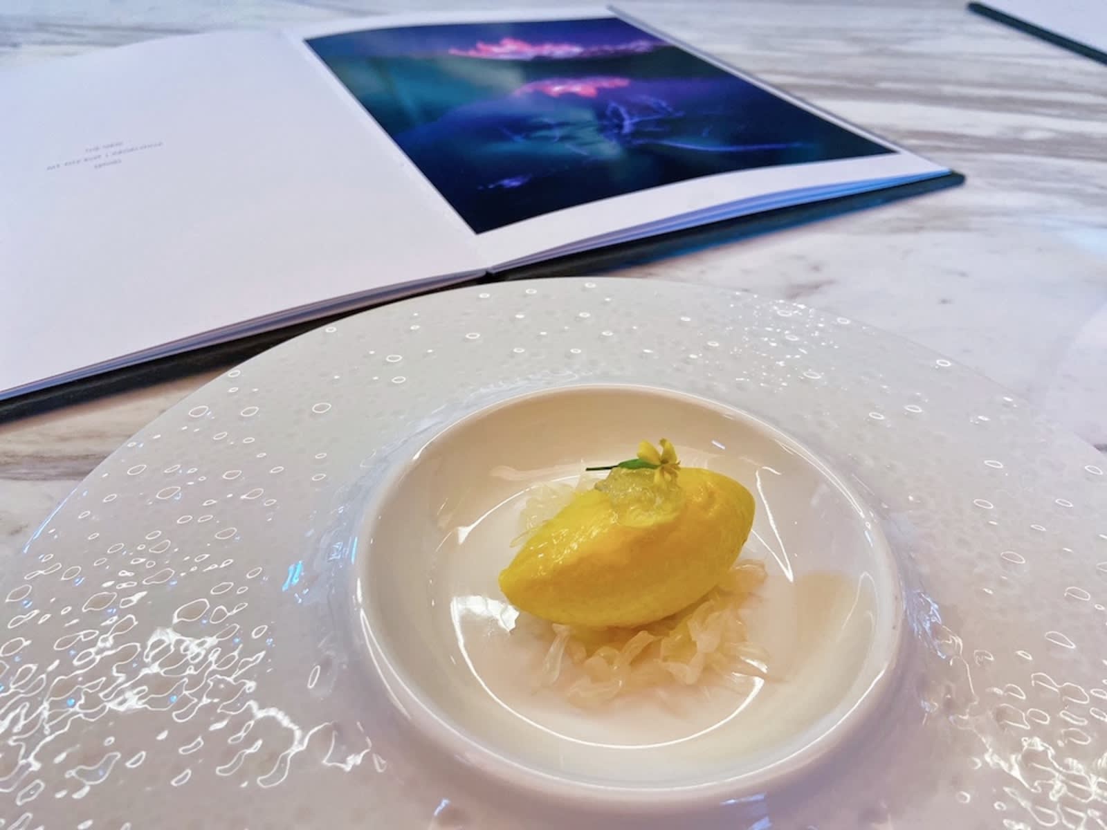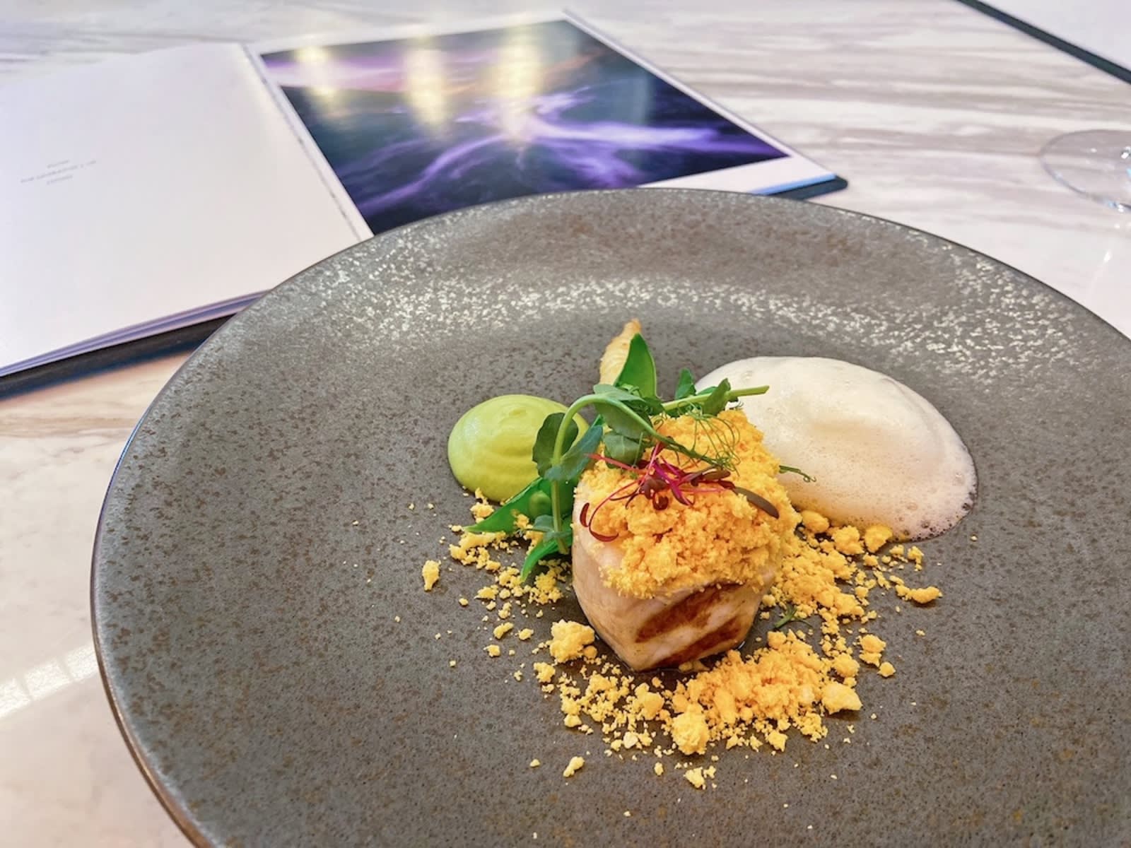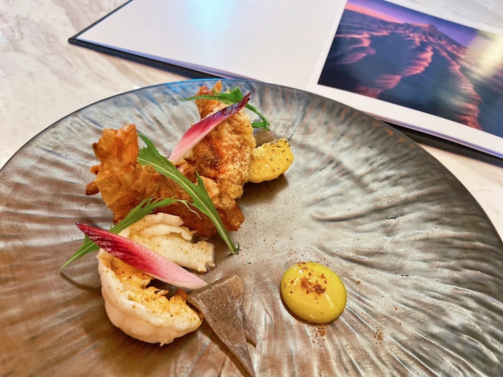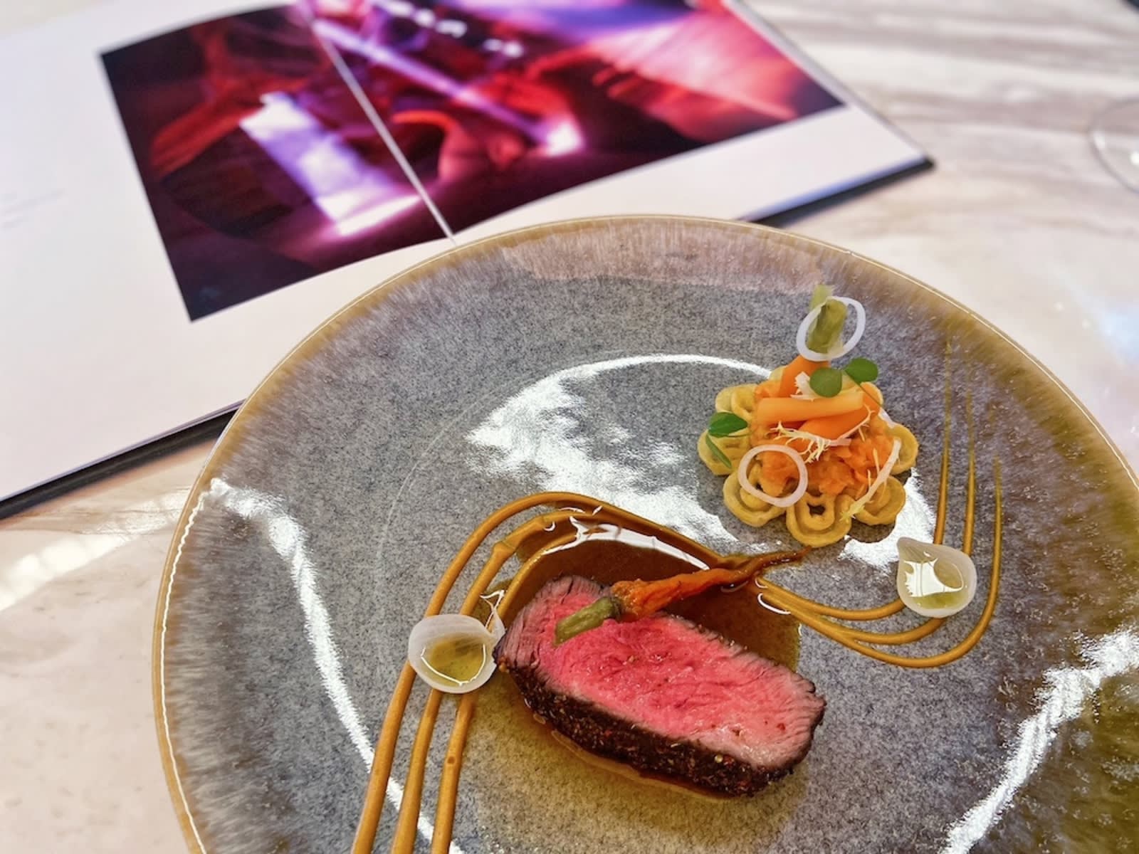 This photo of Antelope Canyon, which inspired the decor of the restaurant, is presented alongside an Angus beef and carrot dish. The Angus beef was perfectly cooked to a juicy blush, encased in a flavourful pastrami crust. A curious carrot and milk tea sauce, alongside candy-like carrot jerky and a sugar pastry wheel, complete the dish. The combination of sweet carrot purée with milk tea works surprisingly well with the robust beef, and we also enjoyed the tiny drops of smoked tea oil nestled in mini onion folds scattered around the dish.