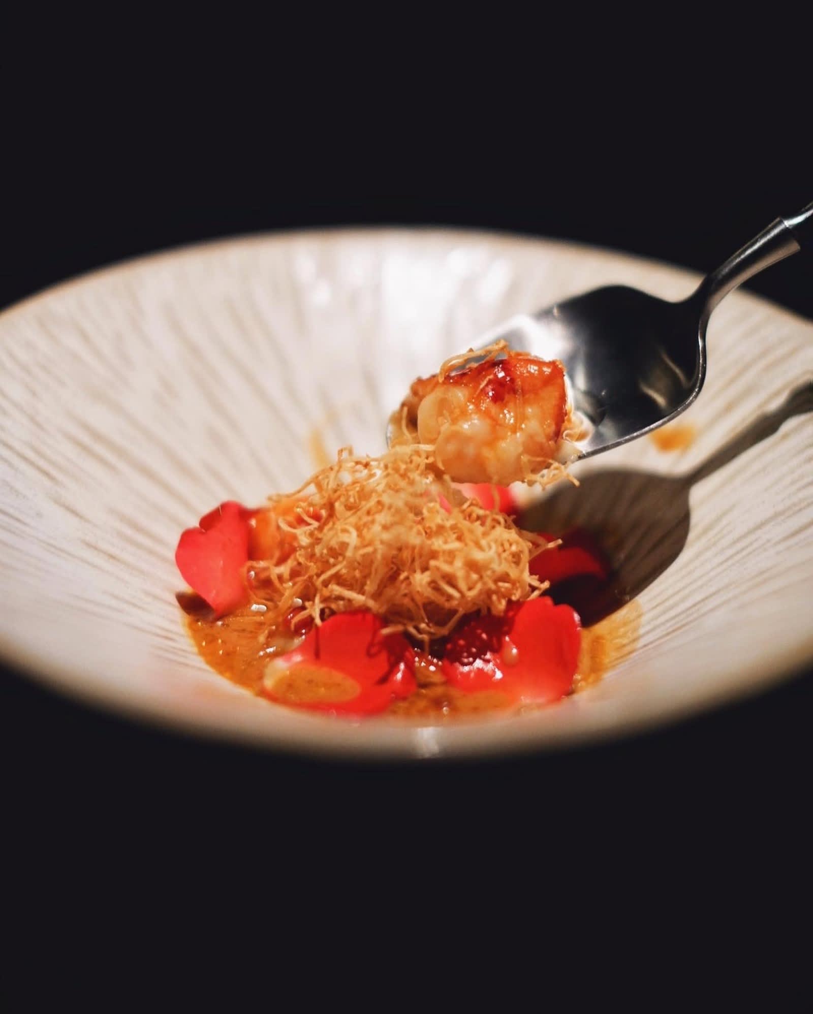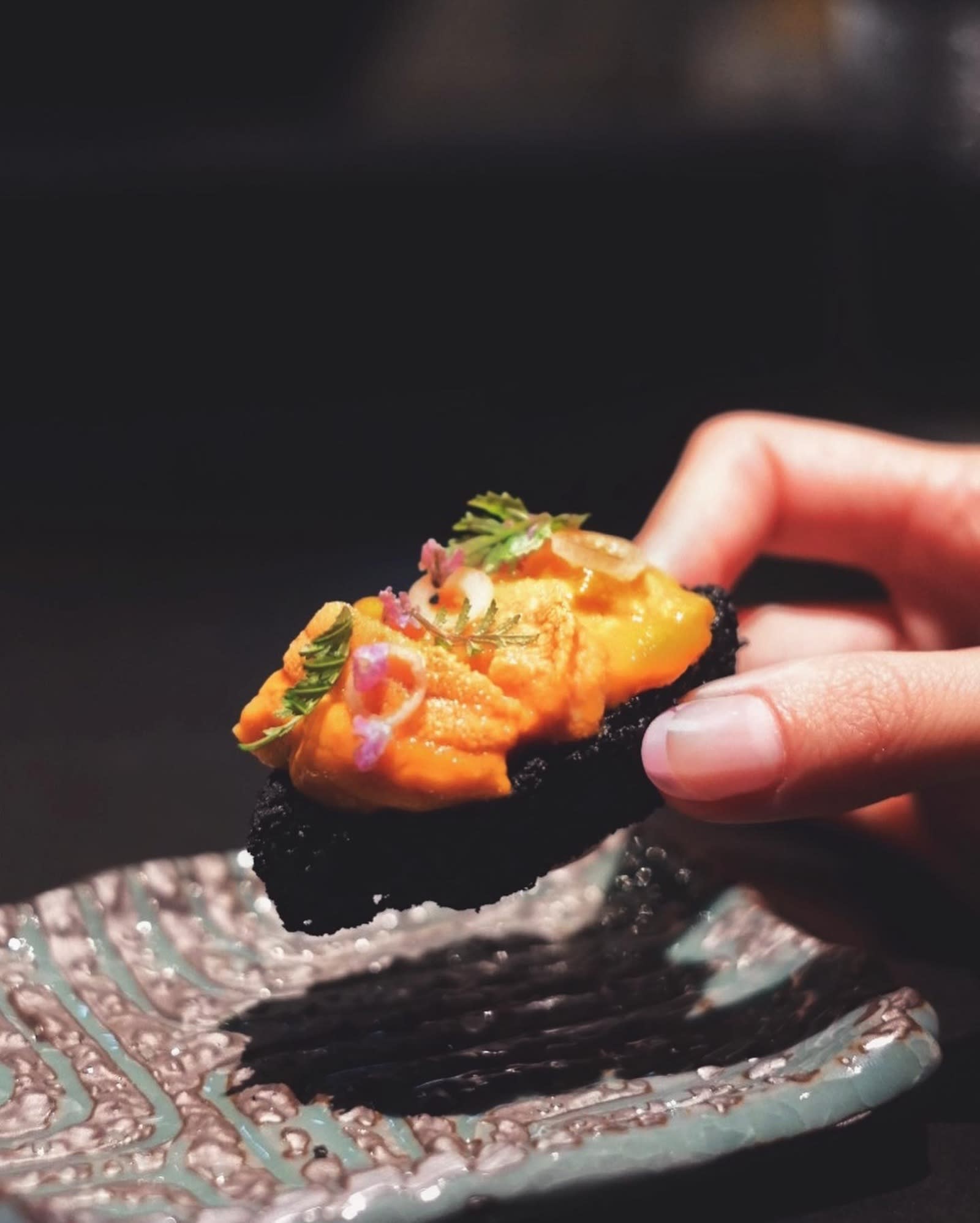 The charcoal brioche was embellished with lusciously sweet and creamy Hokkaido Uni, and topped with pickled onions, yuzu truffle emulsion, shiso dashi and flowers that provided a fresh, citrusy punch.