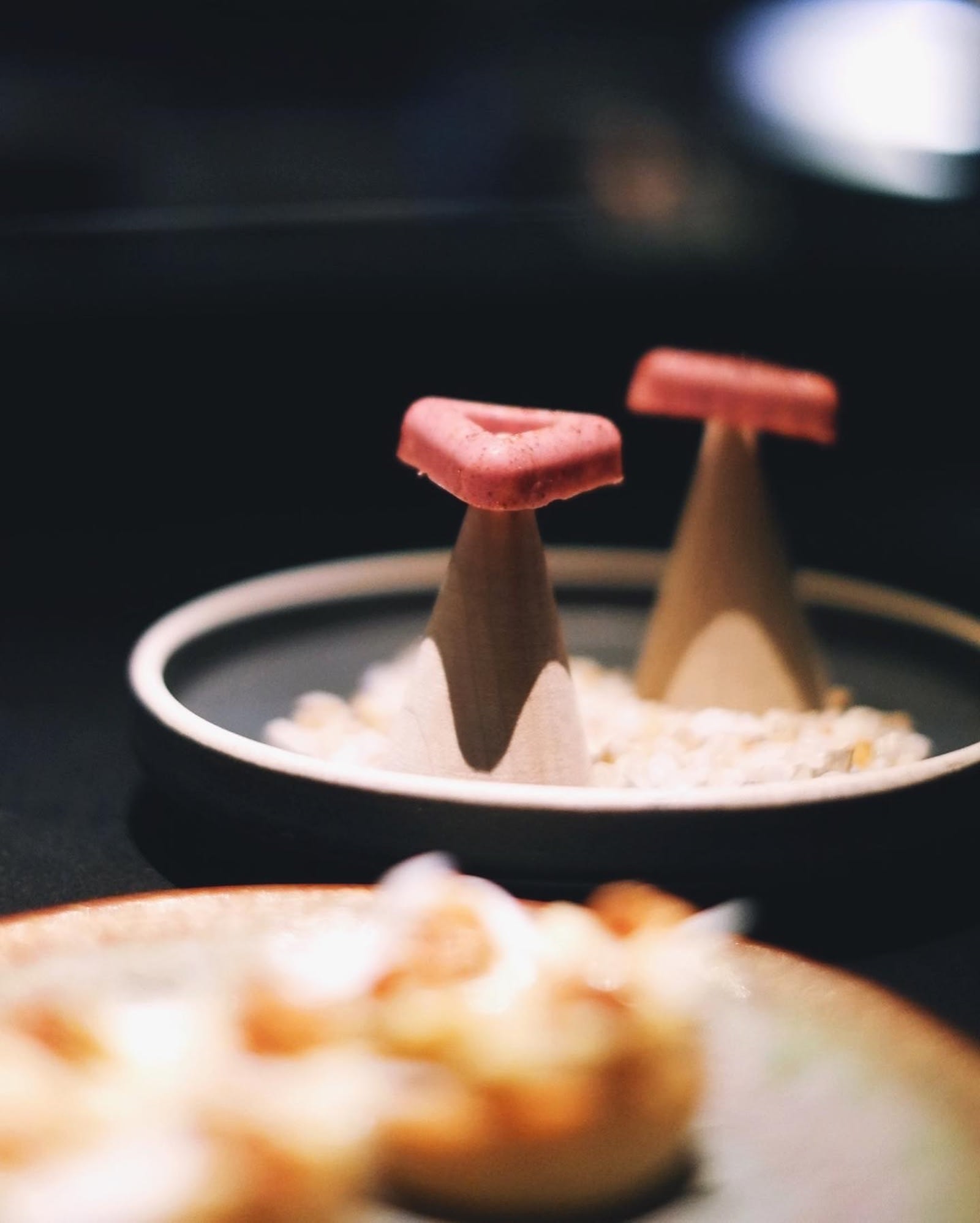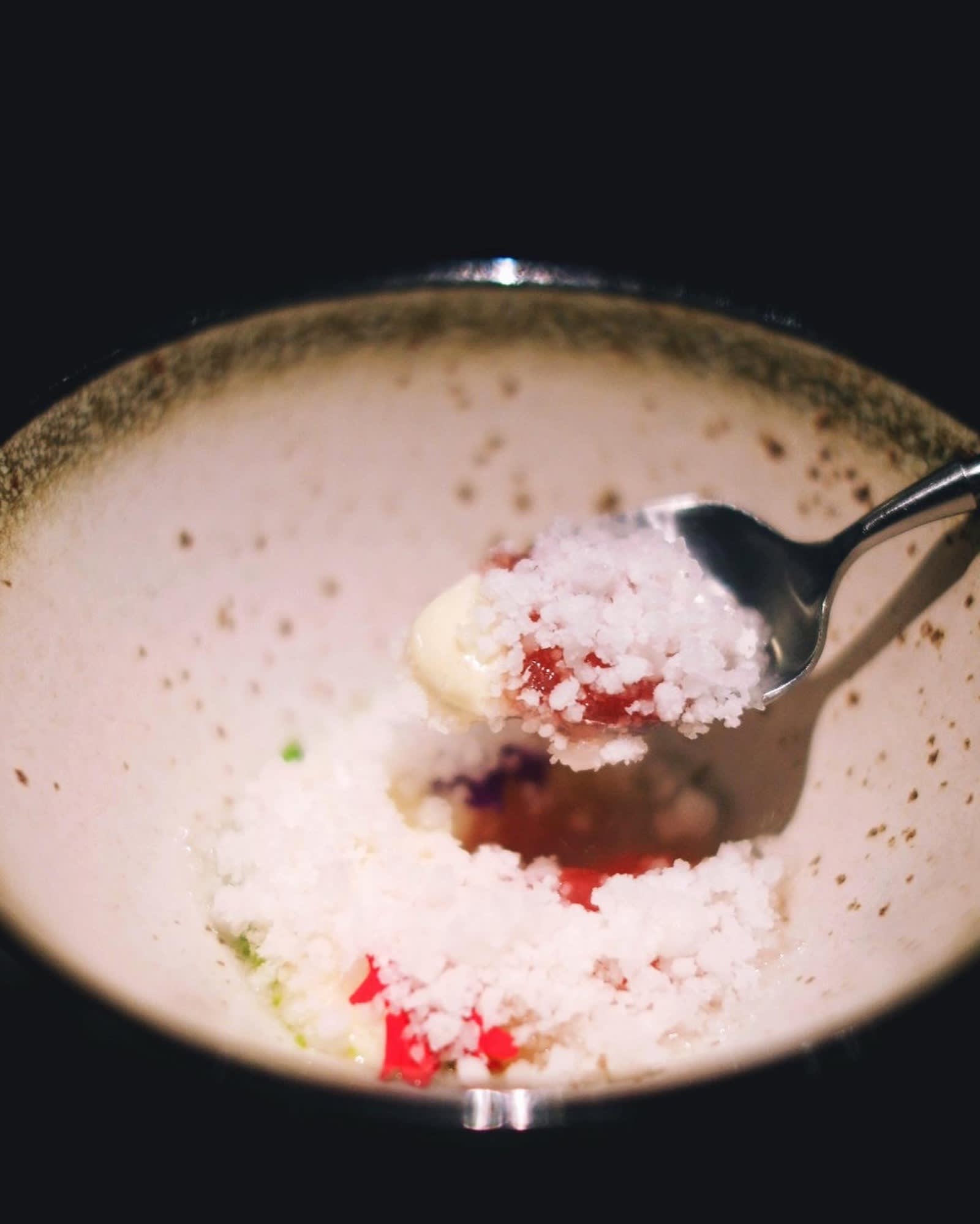 Beneath the blanket of binchotan-infused 3.6 milk mousse and local organic watermelon jelly is an extract of yuzu, galangal and fig. The chef then sprinkled shaved ice made from sugar candy and ginger over it. The resulting taste was potent but comforting.
