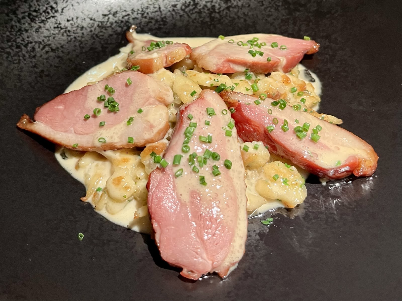 Another pasta recommendation (this time on the heartier end of the spectrum) is the Alsace spätzle (HK$198) – a dish from Chef Elzer’s hometown, here crafted with a fine-dining touch. Pieces of thin, tender smoked duck cooked to medium rare are placed atop the spätzle, which is blanketed in a creamy foie gras sauce. I loved the savoury, slightly smoky flavours of this dish.