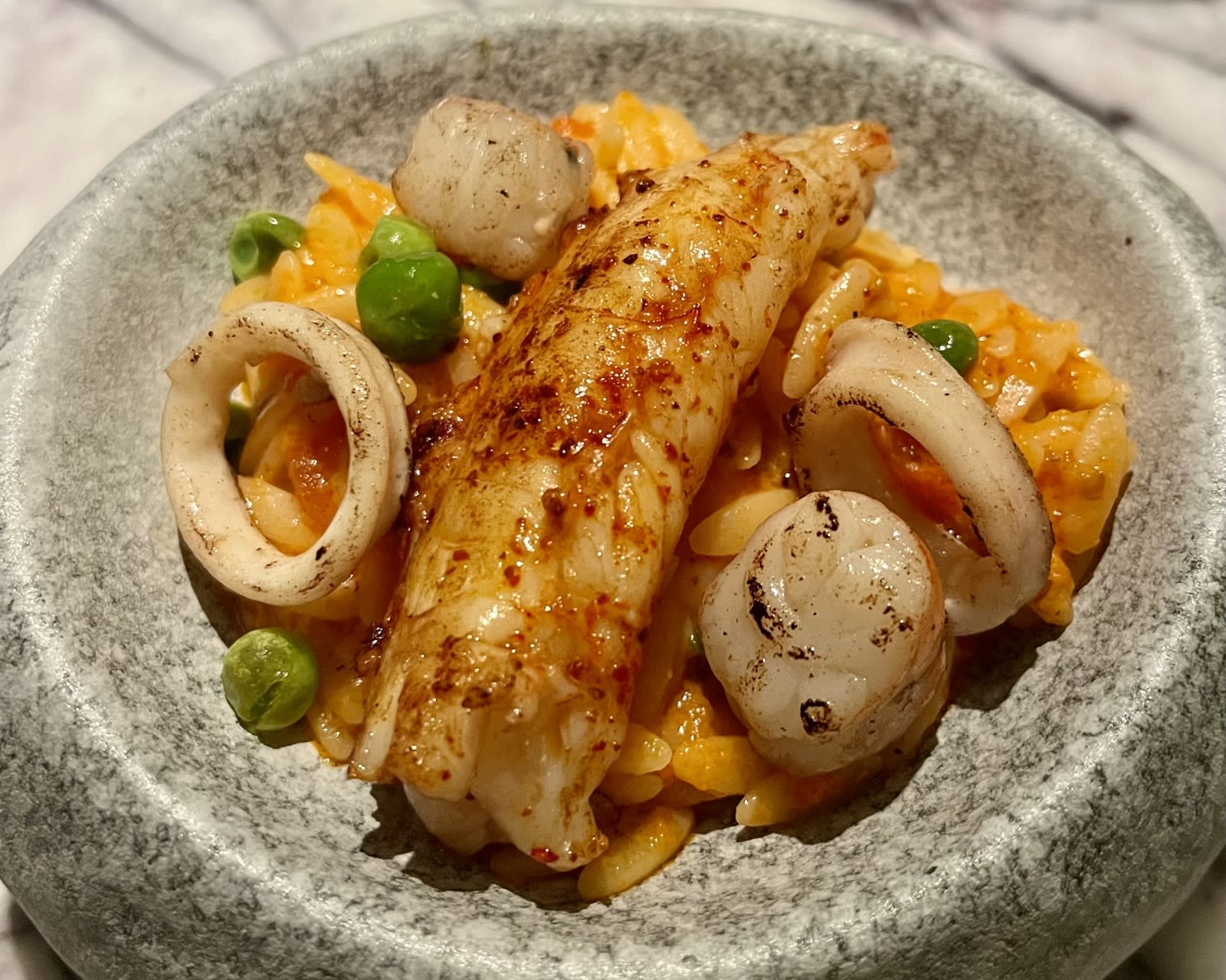 The roasted langoustine with pasta risotto (HK$498) is a tomato-based dish showcasing riso pasta topped with small pieces of roasted langoustine. Focusing on softer textures, the masala spice mixture added to the dish gives a dynamic flavour profile. The masala mix isn’t crazy hot; its warm flavour accentuates the tomato base and natural sweetness of the langoustine.