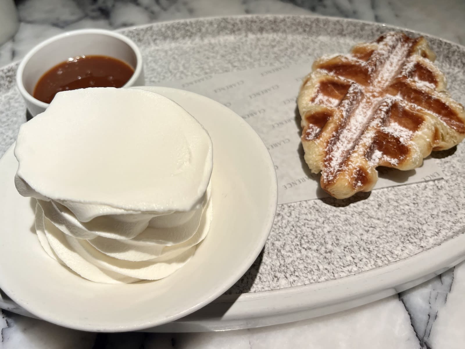 The desserts at Clarence are simple and generous in portion. The fun, out-of-the-box croffle (HK$128) is perfect for two to share. Croissant dough is pressed into a waffle machine – dense yet fluffy in the middle, with double the buttery flavour. The soft serve made with Isigny milk holds its structure on the plate but melts immediately in the mouth; it isn’t super sweet, so it doesn’t overpower the flavours of the waffle and caramel sauce.