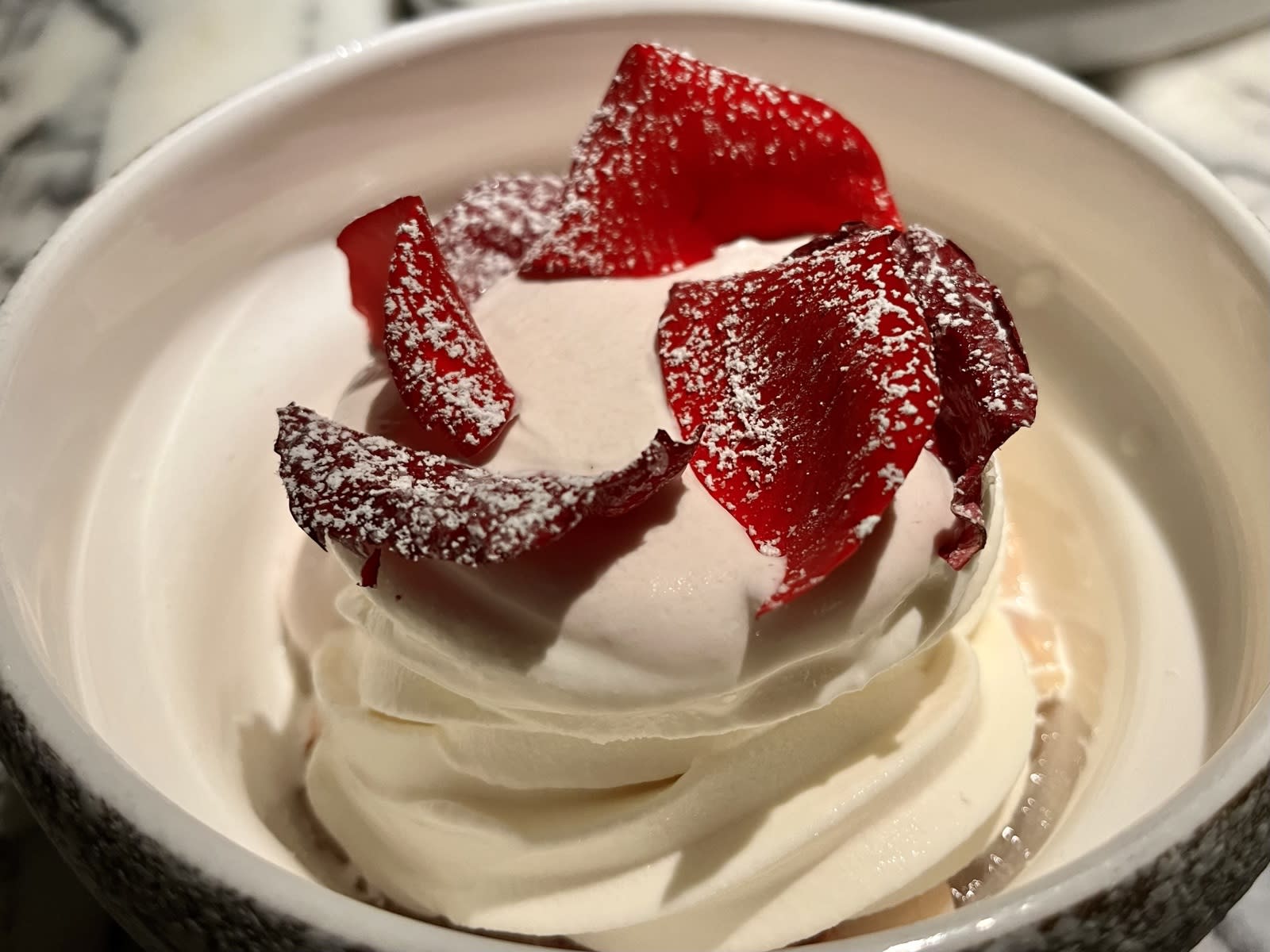 The dessert of lychee, rose petal and raspberry (HK$138) features another large portion of soft serve, also ideal for sharing. Inspired by Chef Elzer’s stint at Joël Robuchon, the ice cream has an intense flavour of rose, made with rosewater jelly, rose espuma and rose petals. Raspberry sorbet is hidden underneath, with fresh lychee completing the dessert’s delicate flavour profile.