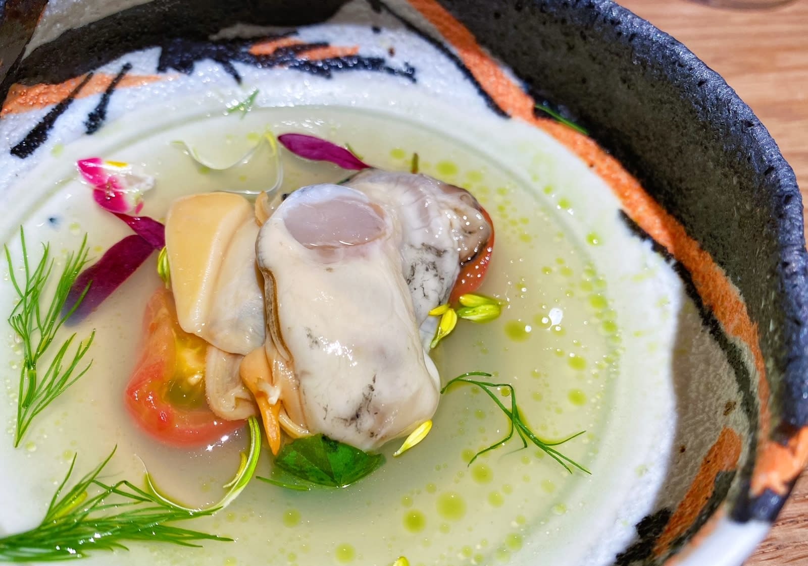 The shellfish cold soup features torigai (cockle) and oyster. The meat of both large shellfish was succulent and packed with briny, umami juices, and we particularly loved the cold tomato-based soup – a refreshing, sweet cool-down from the late summer heat. The umami sweetness of the tomato heightens the flavours of the oyster and cockle. Dill, not something often seen on a Japanese menu, adds interest to the flavour profile.