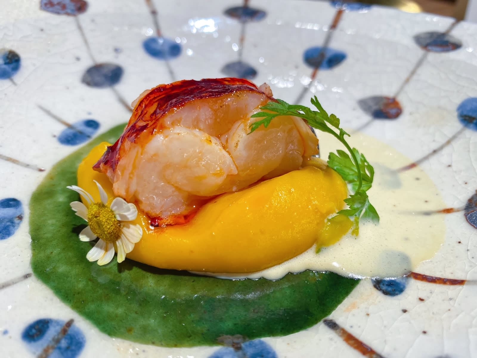 One of our favourites on the menu, the French blue lobster sits atop pumpkin purée and anglerfish liver sauce. The lobster we had was perfectly poached, with a slight bouncy wobble at the centre of the succulent tail, pairing well with the silky, sweet pumpkin purée and liver sauce. We tried to chew slowly to savour each bite.