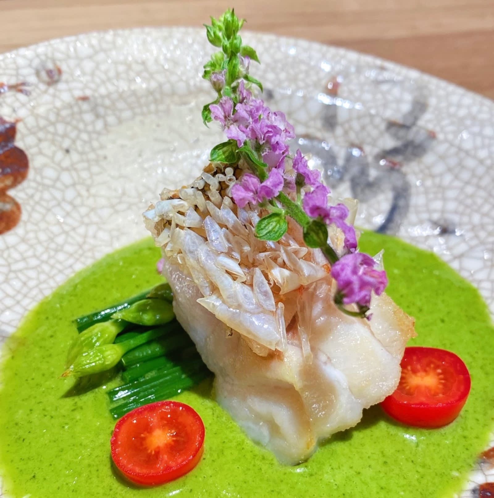 A stunning dish to behold, the amadai rests on a bed of fine pesto, accompanied by sautéed chives. The scales of the tilefish are puffed and crispy thanks to the hot oil that’s poured over the top right before plating. This fish is buttery, flaky and absolutely delicious, particularly when smeared with the vibrant herb sauce.