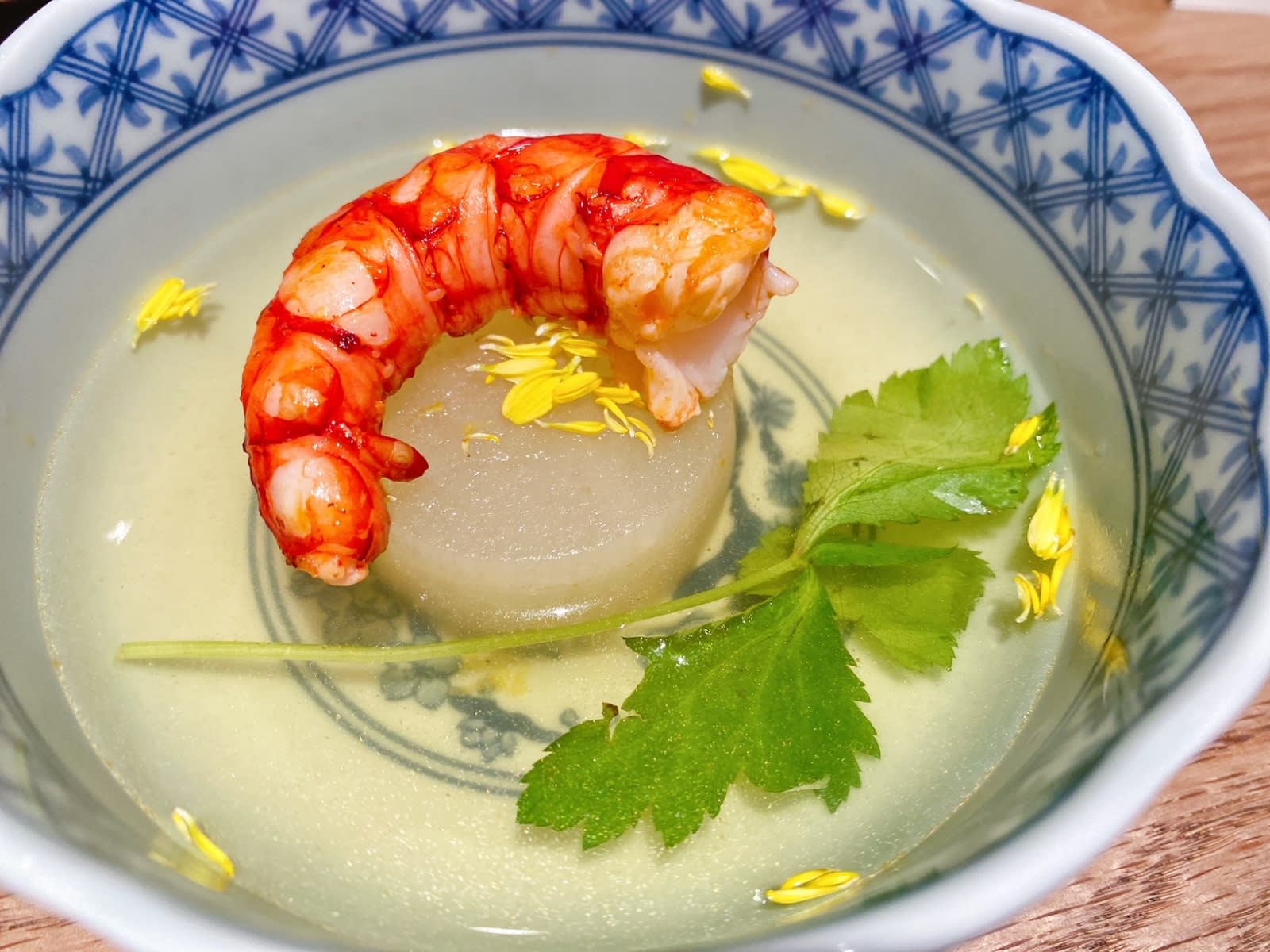A soothing bowl of dashi simmered with daikon and red prawn helped to wash down all that decadence.