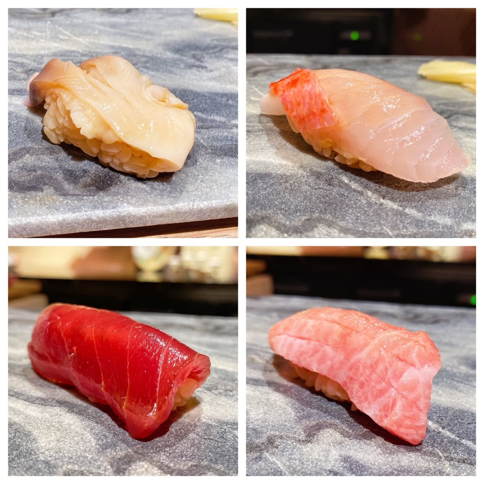 From top left clockwise: hokkigai (surf clam), kinmedai, otoro, maguro akami (tuna)