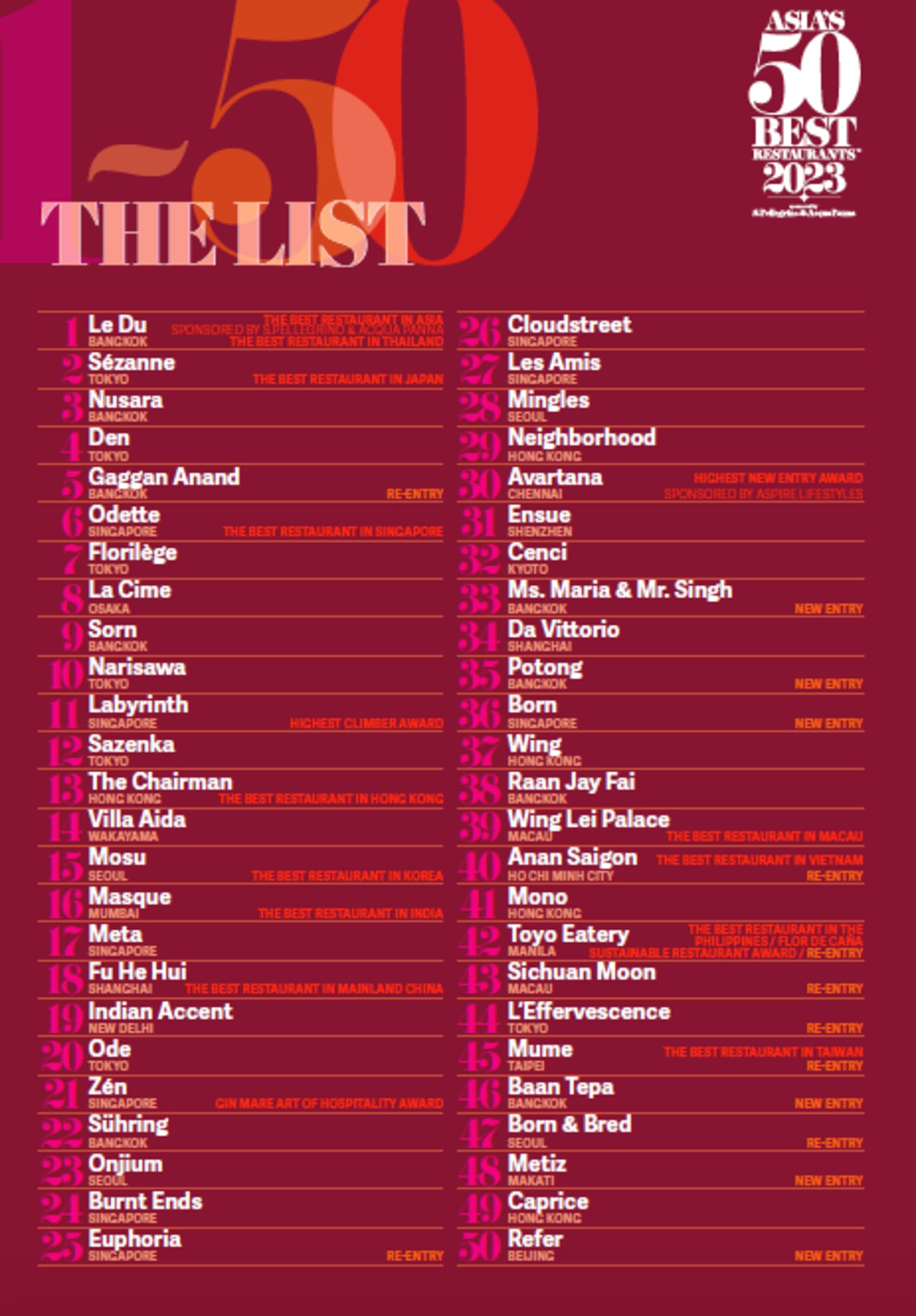 As usual, Japan is killing it on the list, with 10 restaurants featuring in the top 50. In addition to all the awards mentioned above, Shinobu Namae, the executive chef of L’Effervescence (20) in Tokyo, has received the Icon Award for his pioneering efforts in sustainability. Notably, L’Effervescence has been voted into nine editions of Asia’s 50 Best Restaurants and also received the Sustainable Restaurant Award in 2018 and the Highest Climber Award in 2021.