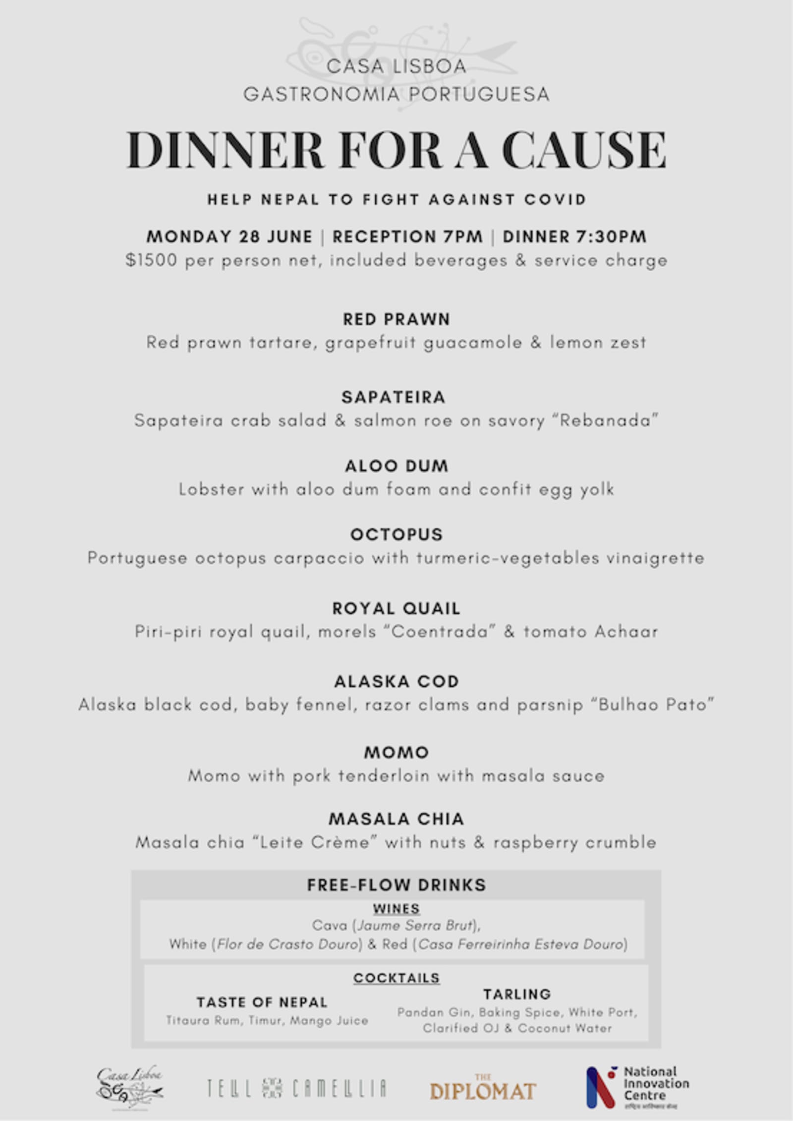 Nepal also needs our help in fighting COVID-19! We can do this by booking Casa Lisboa’s Dinner for a Cause charity dinner ($1,500/person) from 7pm on 28 June, with all proceeds donated to the National Innovation Centre in Nepal. The ticket price is inclusive of free-flow signature cocktails, cava and Portuguese wines and innovative eats by Executive Chef Jesus Pascual and three Nepali F&B superstars: Chef Makhim Arun (formerly of Caprice and Zuma), Sachin Gurung from The Diplomat and Gagun Gurung from Tell Camellia.